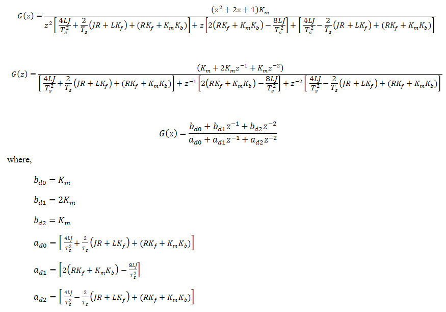 Motor torque constant : Km= Armature Inductance : L= Armature Resistance : R= Moment of inertia : J= Coefficient of Friction : Kf= Back emf constant : Kb= Sampling Time (sec) : Ts=